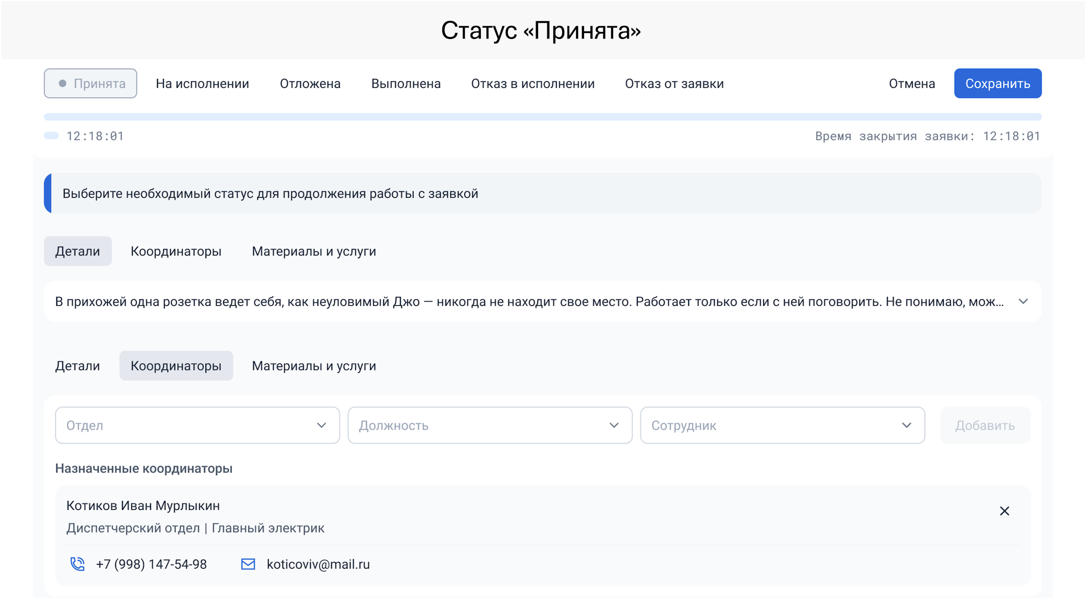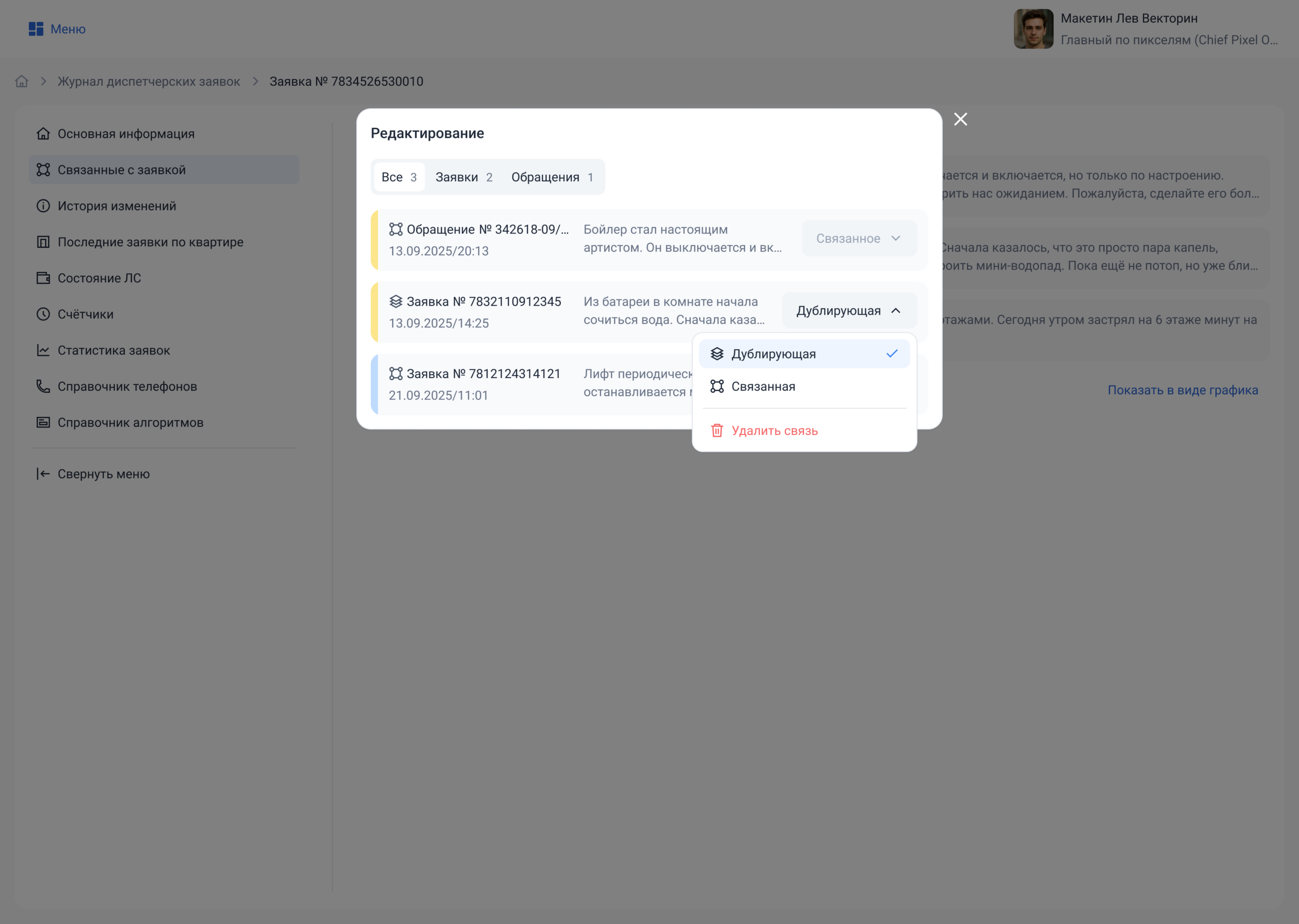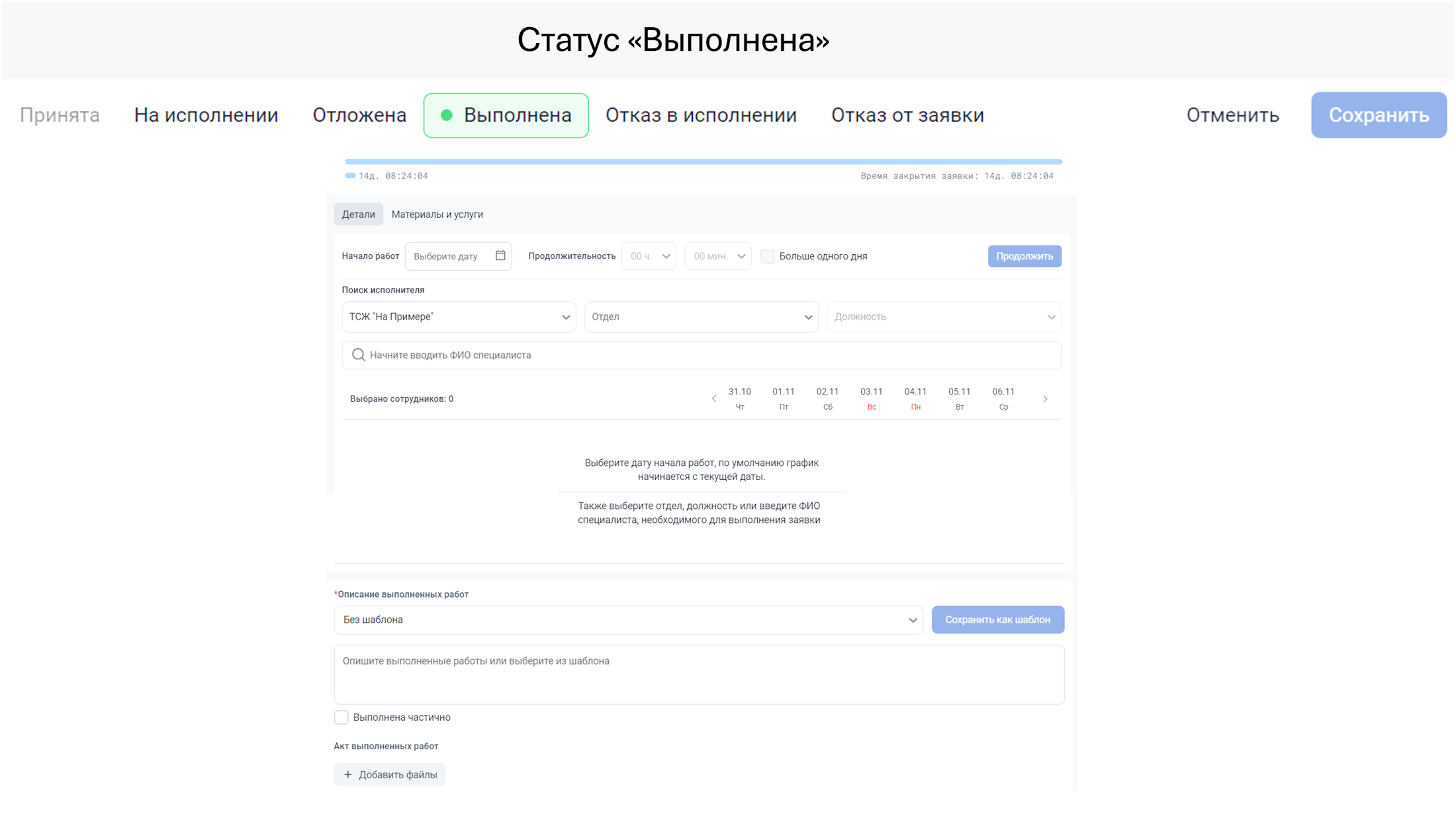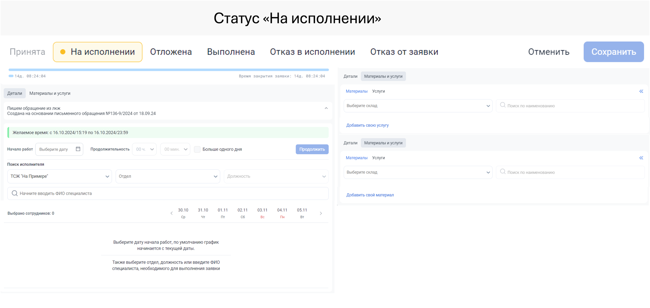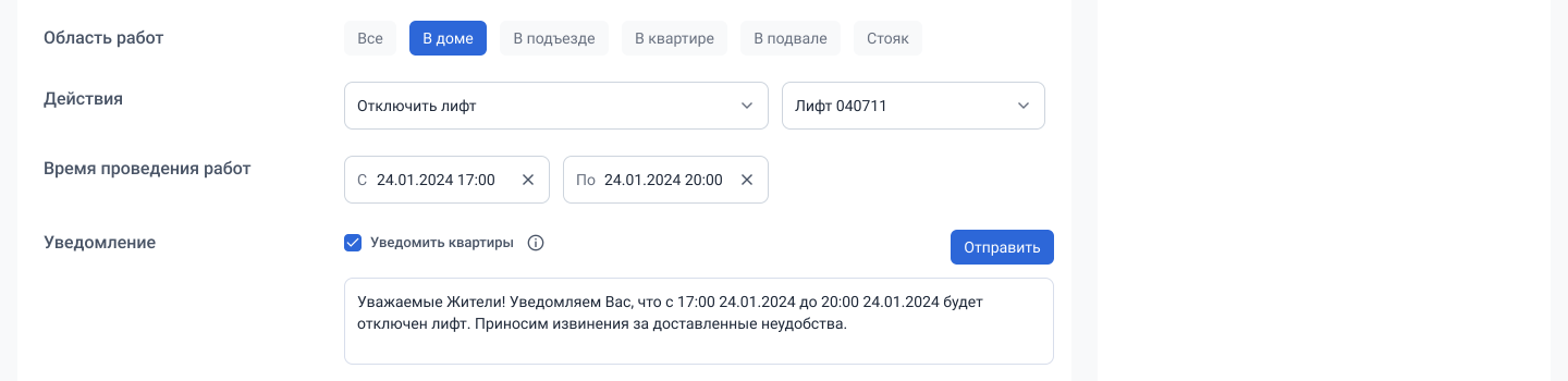 Для аварийных заявок будет дополнительно доступен выбор области работ и действий. Без заполненной квартирограммы будут недоступны действия (например, уведомление жителей тех квартир, в которых будет отключена горячая вода).