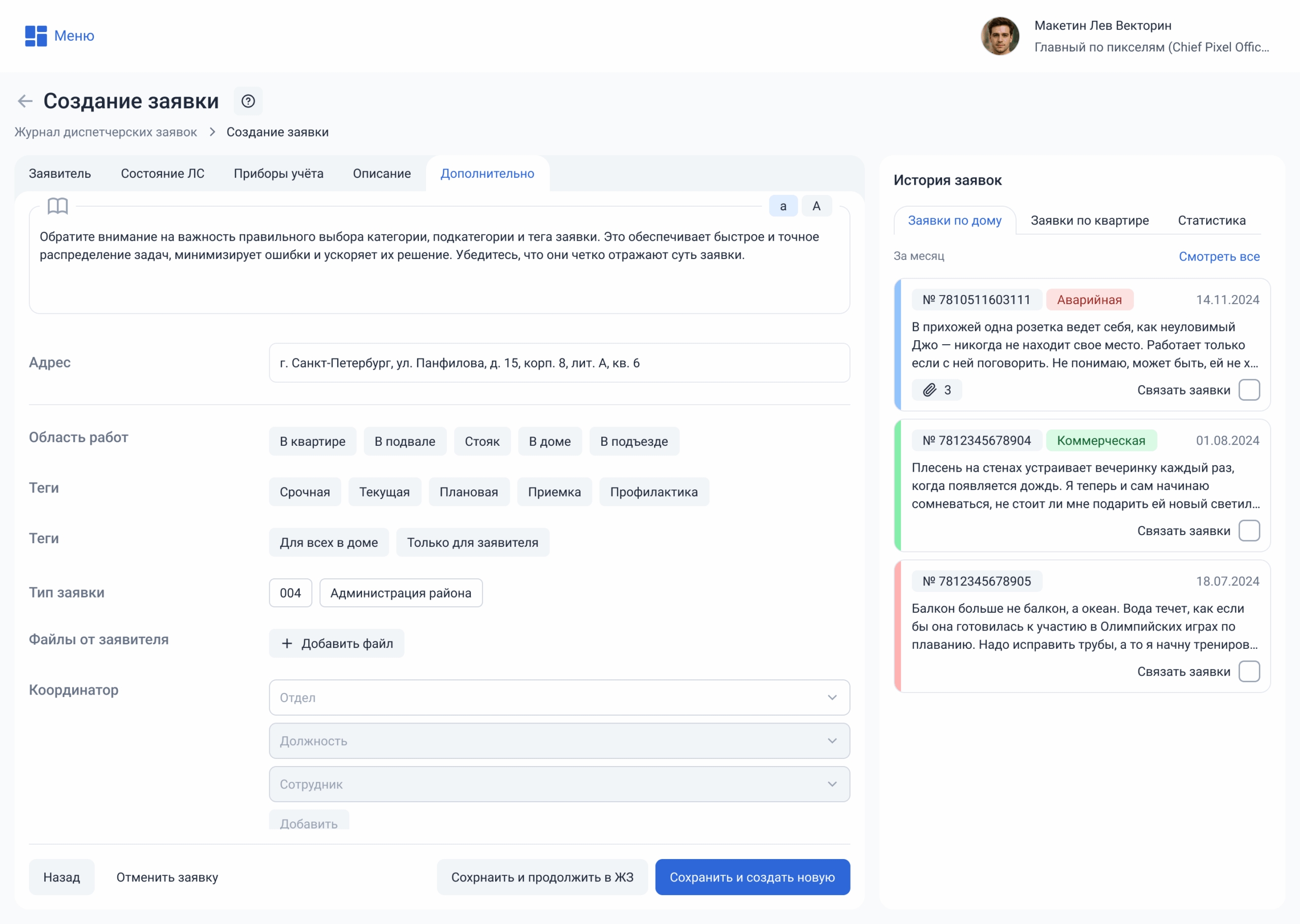 «Сохранить и создать новую» (если нужно создать еще одну заявку).