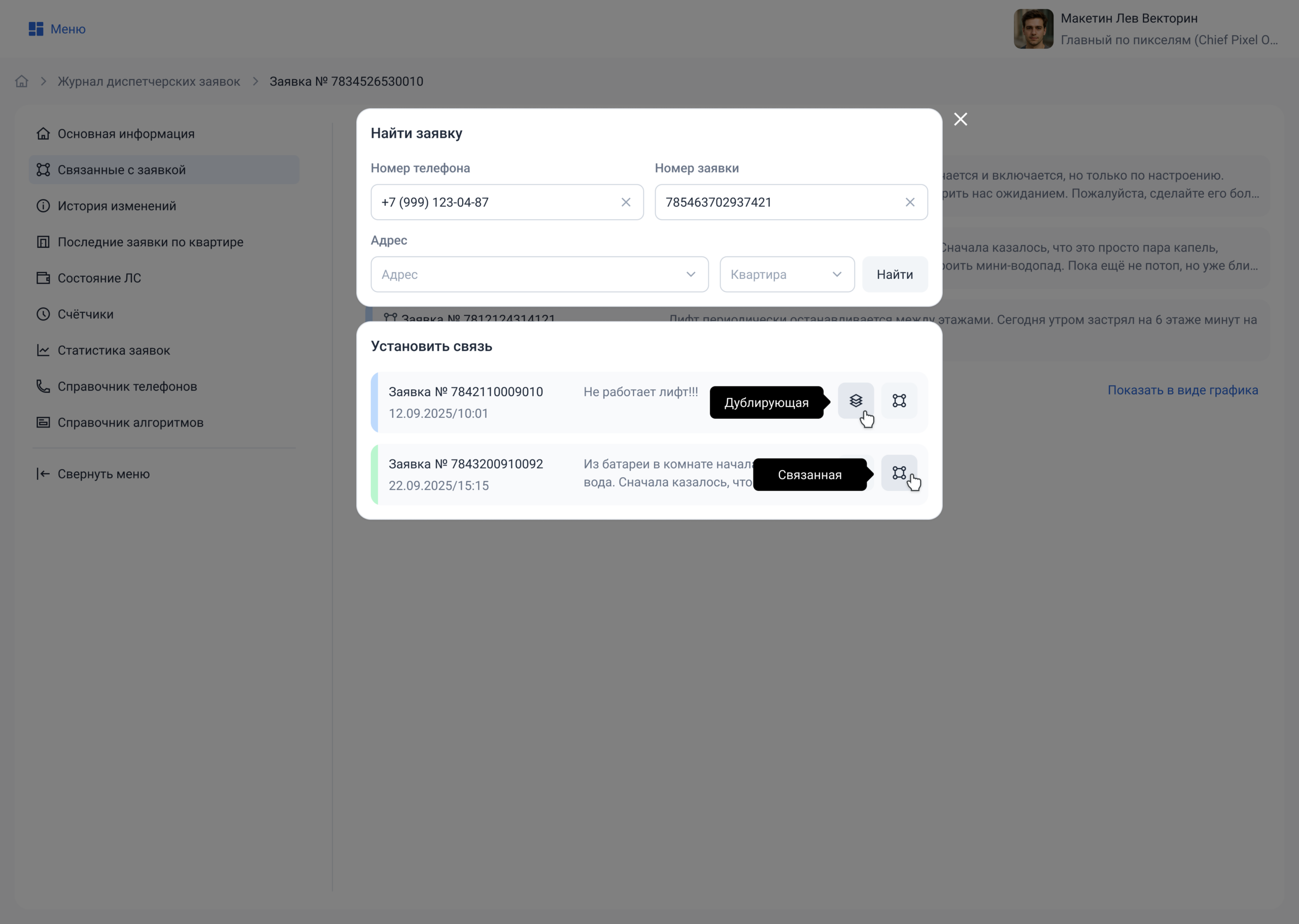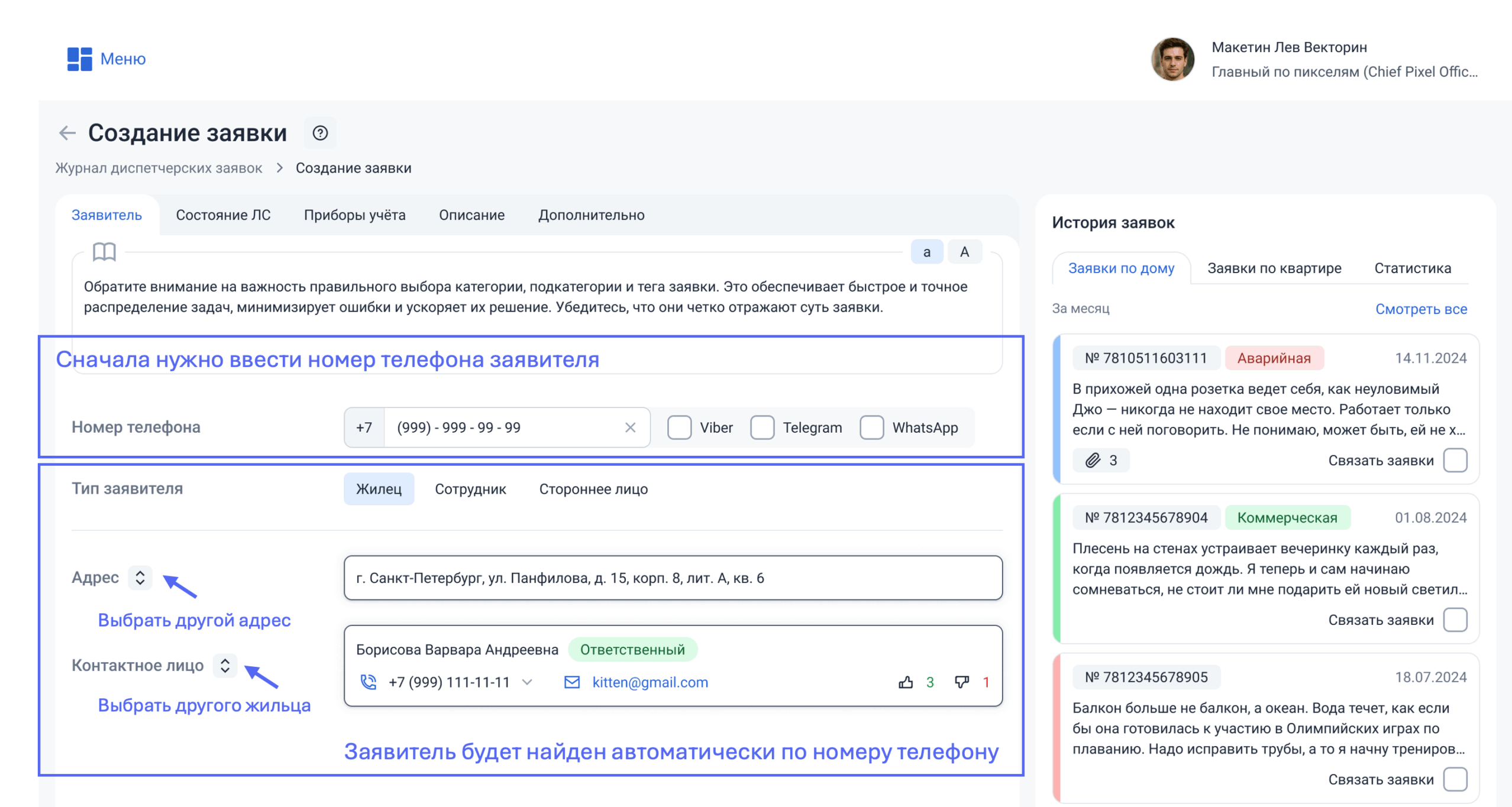 Если номер телефона не найден в базе, самостоятельно выберите из списка адрес, а затем ФИО заявителя.