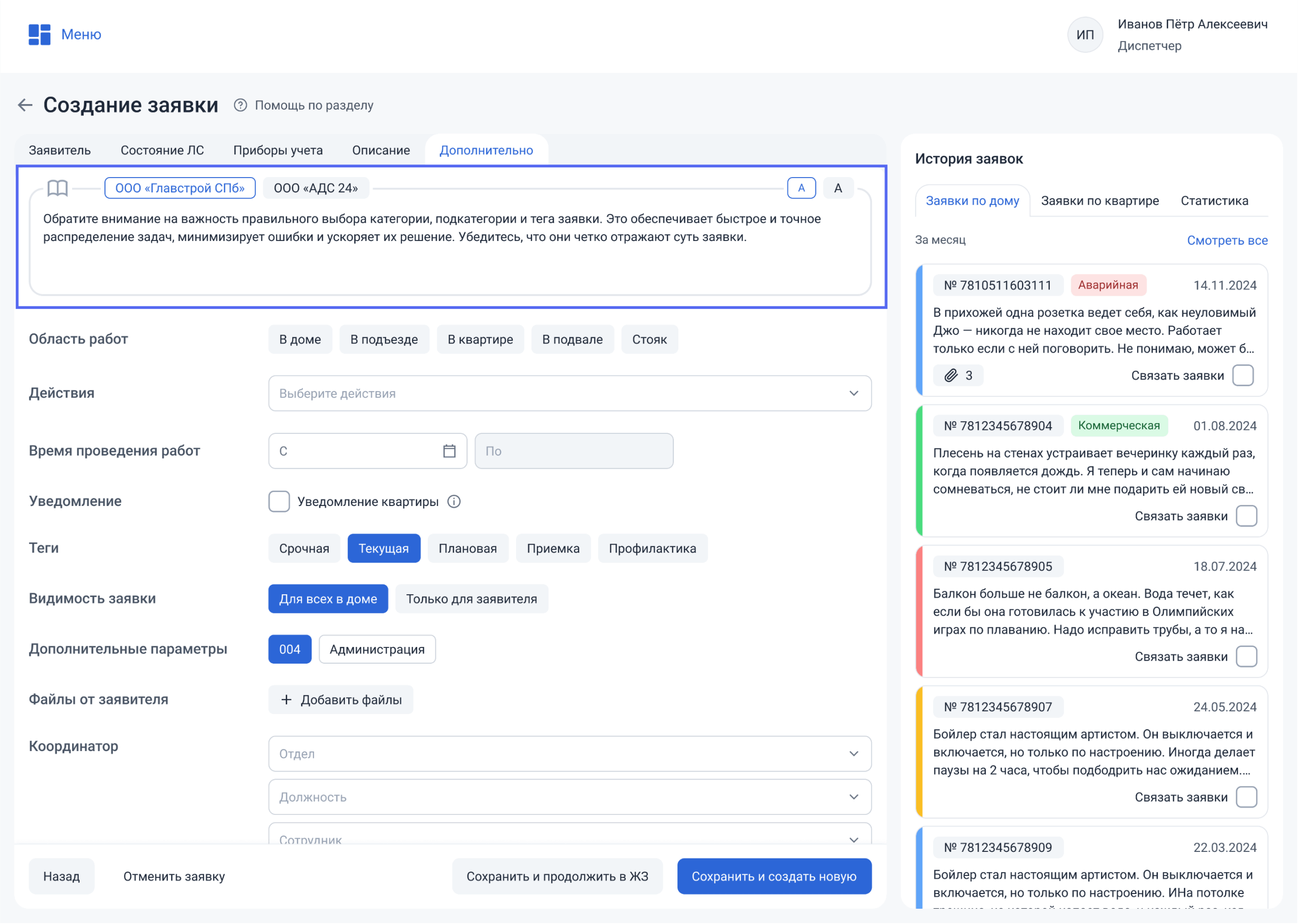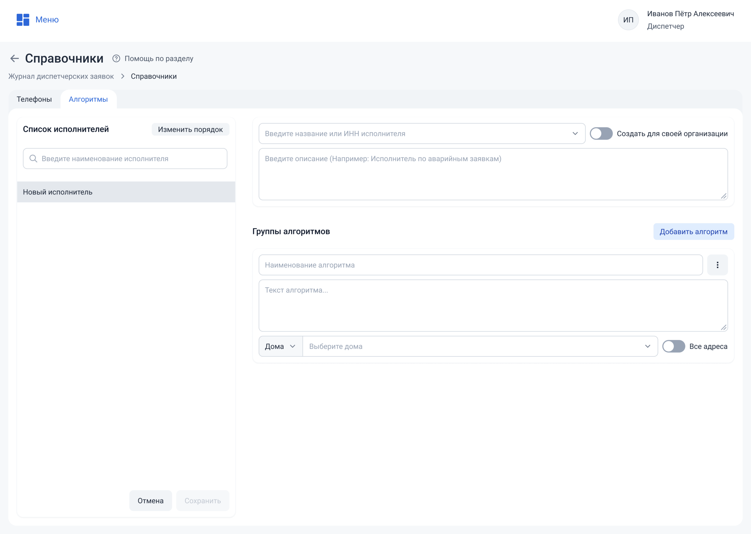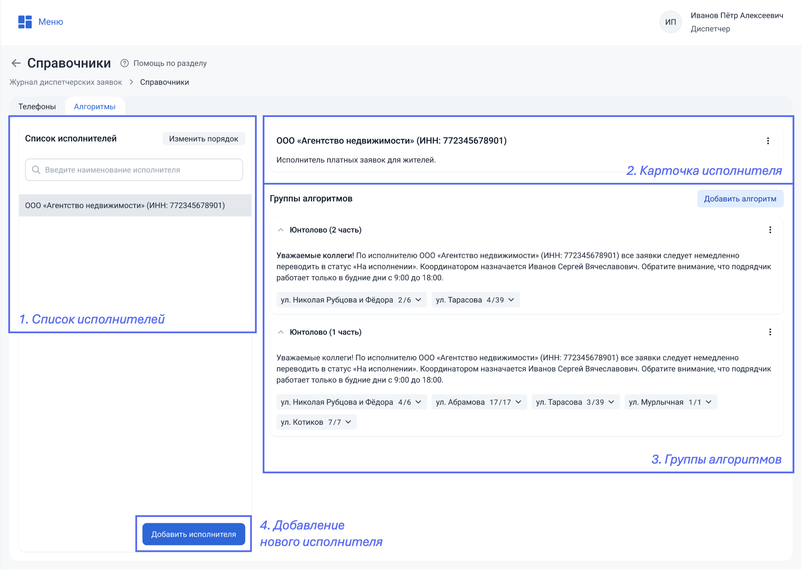 Алгоритм — это внутренняя инструкция в виде текста, которую диспетчер видит при создании заявки. Она напоминает сотруднику, какие действия нужно выполнить при обработке заявки по конкретному адресу.