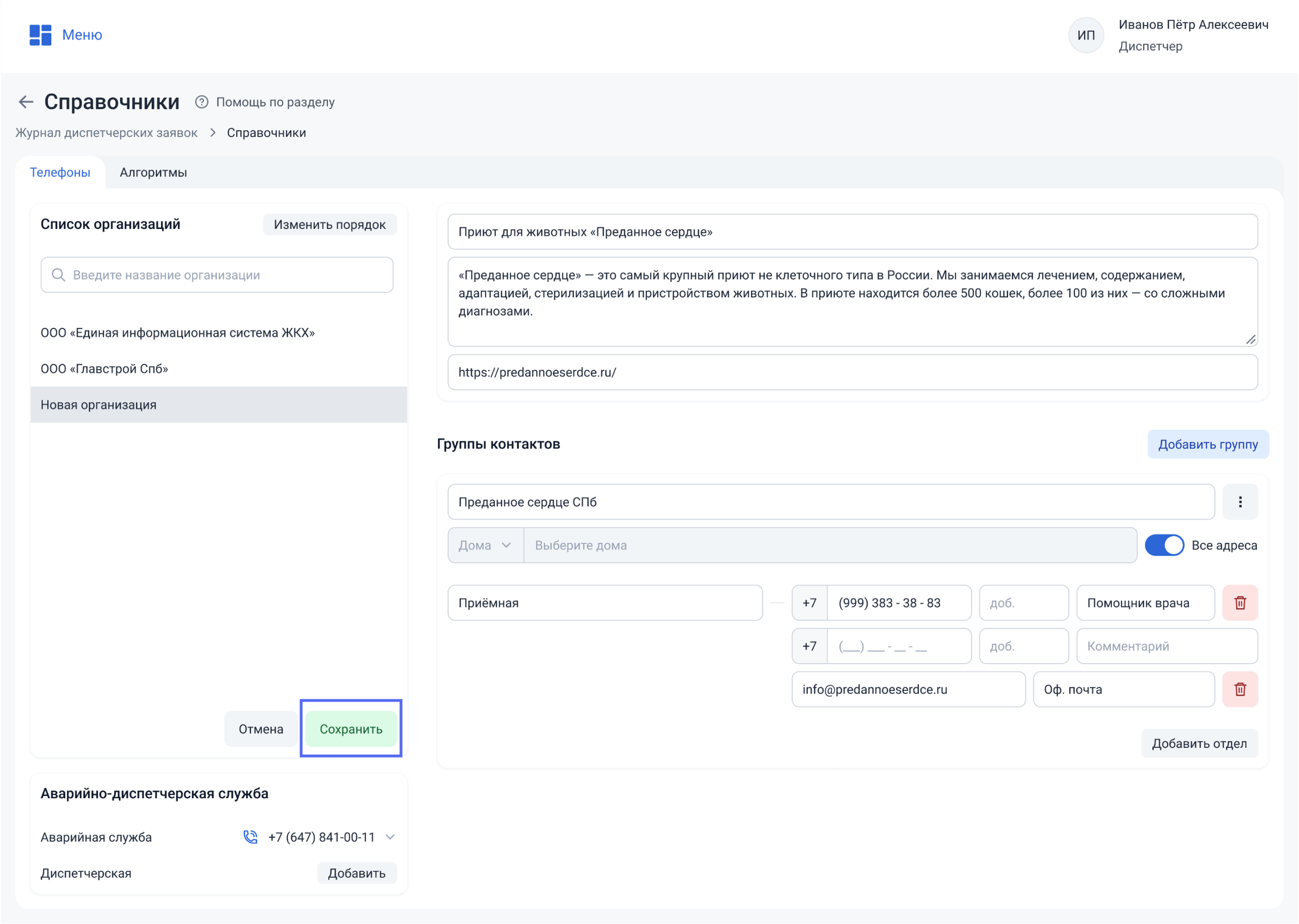 Для сохранения новой организации с группой контактов нажмите на кнопку «Сохранить».
